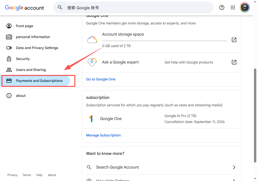 Go to myaccount.google.com → Billing & Subscriptions.
